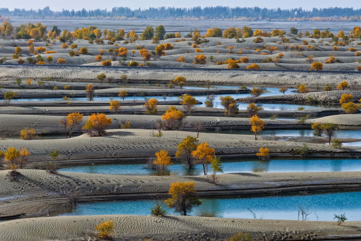 An aerial drone photo taken on Oct 20, 2025 shows the scenery of populus euphratica forests on a lake in Hotan county of the Hotan prefecture, Northwest China's Xinjiang Uygur autonomous region. [Photo/Xinhua]