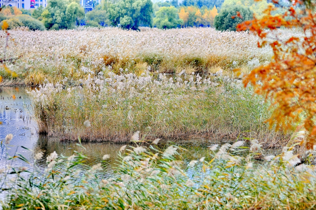 In the deep autumn season, the reeds at Qunli National Urban Wetland Park in Harbin, Heilongjiang province have turned from green to golden, contrasting beautifully with the colorful foliage along the shore. When the wind blows, waves ripple through the reeds, and their leaves rustle softly. Vast clusters of white reed blossoms sway in the breeze like snow or mist, creating a magnificent scene.