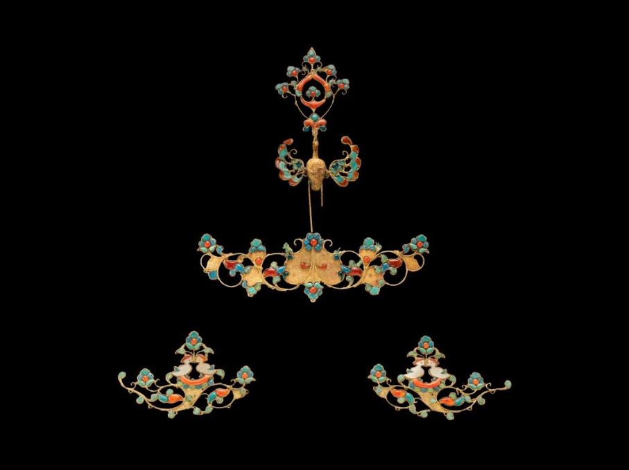 Gold crown ornaments in the design of phoenix and mandarin duck holding flowers in their beaks, Tang Dynasty (618-907) [Photo/Capital Museum official WeChat account]