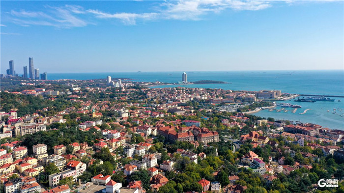 The deep blue sky provides a stunning backdrop for the vibrant mosaic of red-roofed houses, lingering greenery, and historic buildings in Qingdao's old city. [Photo/Guanhai News]