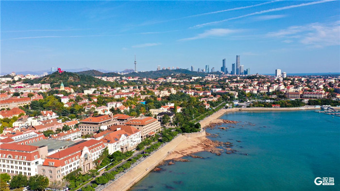 From a bird's-eye view, the urban tapestry of Qingdao's old city area seamlessly blends with the vast sea, presenting a harmonious picture of man and nature. [Photo/Guanhai News]