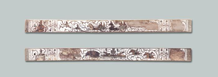 This Western Han Dynasty (206 BC-AD 24) wooden ruler depicts a continuous pictorial scene of chariots and horses on the move with paintings on both sides. An elephant chariot is a highlight, on which two figures sit face to face and beat drums. Abundant motifs such as swirling clouds, mountains and immortals blend reality and myth.