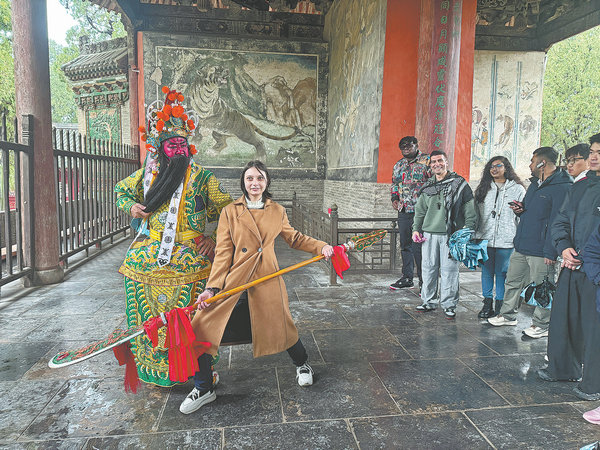 A tour member poses for a photo with an actor playing Guan Gong at the Guandi Temple in Yuncheng. [Photo/WEI BO/YAN CHANGJIANG/FOR CHINA DAILY]