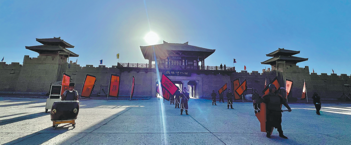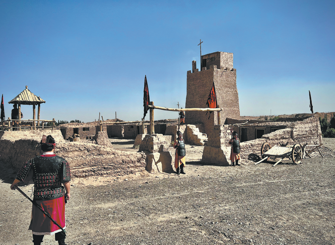 An on-site museum presents swords, arrowheads and a mummified infant that testify to the traversal of borders, not just among nations but between life and death. Today, at Yangguan, performers in period costume don't just bring history to life — they stage live-action role-playing reenactments, journeying across centuries to perform as soldiers and officials. One of the most popular activities for visitors is receiving "travel documents" — like passports to travel through time — scrawled on bamboo slips and ceremoniously presented by an ancient official. Visitors can ride to the Yangguan Beacon Tower in an ancient-style donkey-drawn cart or on camel-back. At a nearby outpost, they can team up with soldiers to start fires using the bow-drill technique, as was employed long ago to incinerate stacks of straw to emit smoke signals in the daytime or flames at night.