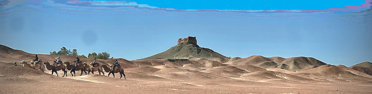 An on-site museum presents swords, arrowheads and a mummified infant that testify to the traversal of borders, not just among nations but between life and death. Today, at Yangguan, performers in period costume don't just bring history to life — they stage live-action role-playing reenactments, journeying across centuries to perform as soldiers and officials. One of the most popular activities for visitors is receiving "travel documents" — like passports to travel through time — scrawled on bamboo slips and ceremoniously presented by an ancient official. Visitors can ride to the Yangguan Beacon Tower in an ancient-style donkey-drawn cart or on camel-back. At a nearby outpost, they can team up with soldiers to start fires using the bow-drill technique, as was employed long ago to incinerate stacks of straw to emit smoke signals in the daytime or flames at night.