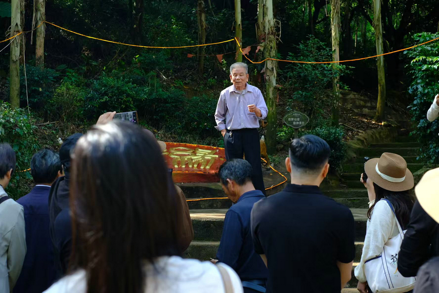 A local senior man tells the group the legend of Xianweng of the Lianhua Mountain in the Chenghai district, Shantou, South China’s Guangdong province, on Oct 29, 2025. [Photo by Yang Xiaoyu/chinadaily.com.cn]