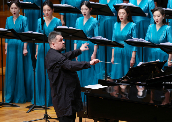 Under the baton of Russian conductor Yevgeny Volkov, the China National Symphony Orchestra Chorus stages a performance on Sunday in Beijing. [Photo provided to chinadaily.com.cn]