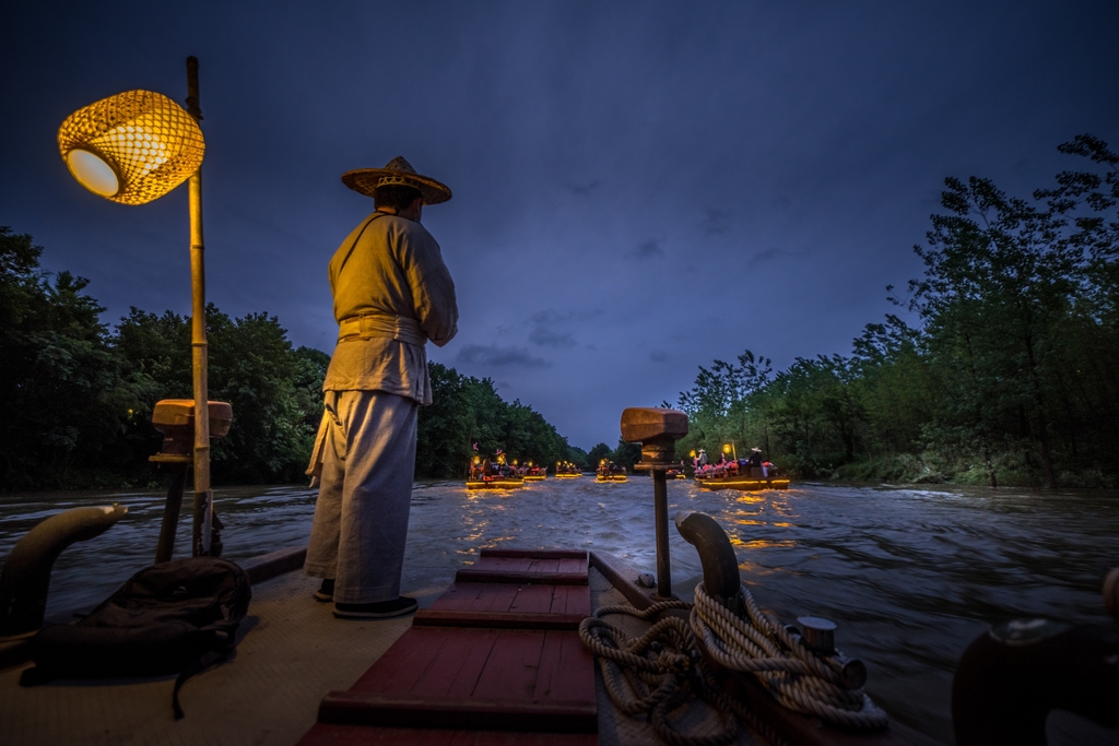 River Theatre: The Peach Colony is a live performance inspired by the 5th-century prose The Peach Blossom Spring, by Tao Yuanming (365-427), a classic tale of a traveler’s chance encounter with a hidden utopia in ancient China. Set on the Qinxi River and presented in an immersive format, the production transforms the waterway itself into a stage — creating the world’s first five-kilometer-long river theater.