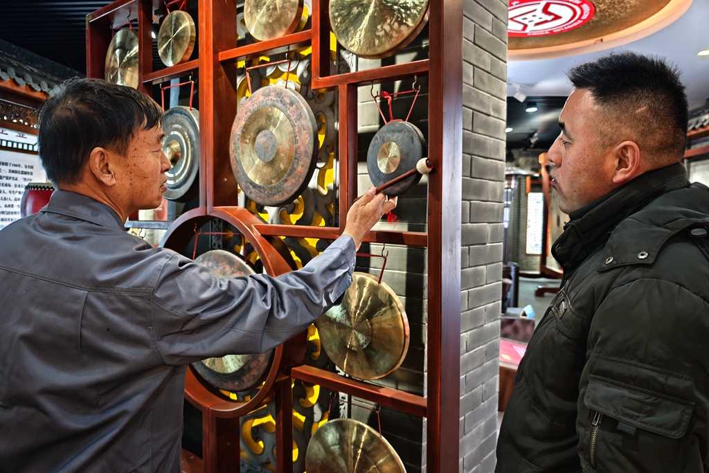 Yan (L) examines gongs. [Photo/IC]