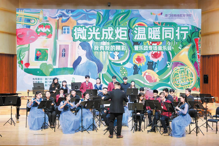 The band from Xiamen Special Education School gives its debut public performance in Xiamen, Fujian province, in 2023. [Photo provided to CHINA DAILY]