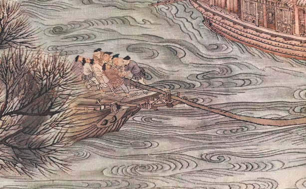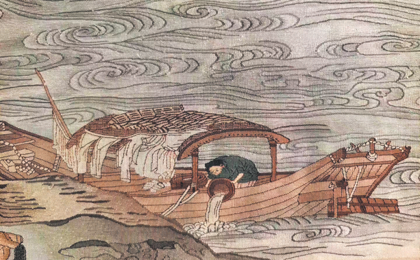 To create the robe of a single boatman, a shuttle — the tool used to carry the horizontal threads through the vertical threads on the loom — carrying dark silk would first outline the shape. Then, a shuttle with lighter-colored thread would fill in the body of the robe.