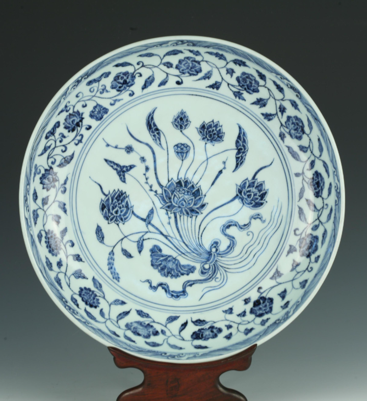 Blue-and-white plate with lotus flower motifs, Ming Dynasty (1368-1644) [Photo/Suzhou Museum official WeChat account]