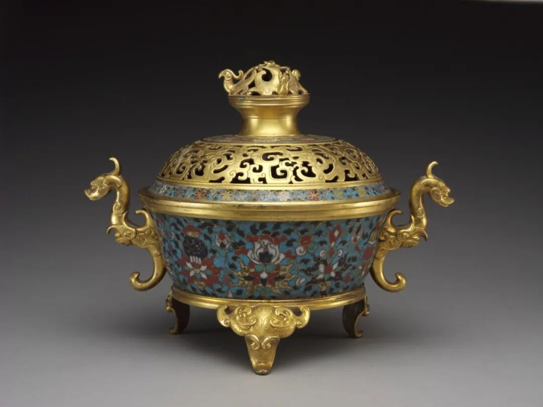 Cloisonné enamel incense burner with two chi dragon-shaped handles and motifs of lotus flowers and diverse treasures, Ming Dynasty (1368-1644), from the collection of the Palace Museum [Photo/Chongqing China Three Gorges Museum official WeChat account]