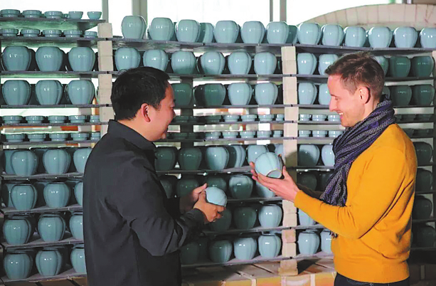 Another trainee, Li Keming (left), and Dutch designer Henny van Nistelrooy visit a collection of Ru kiln ware. CHINA DAILY