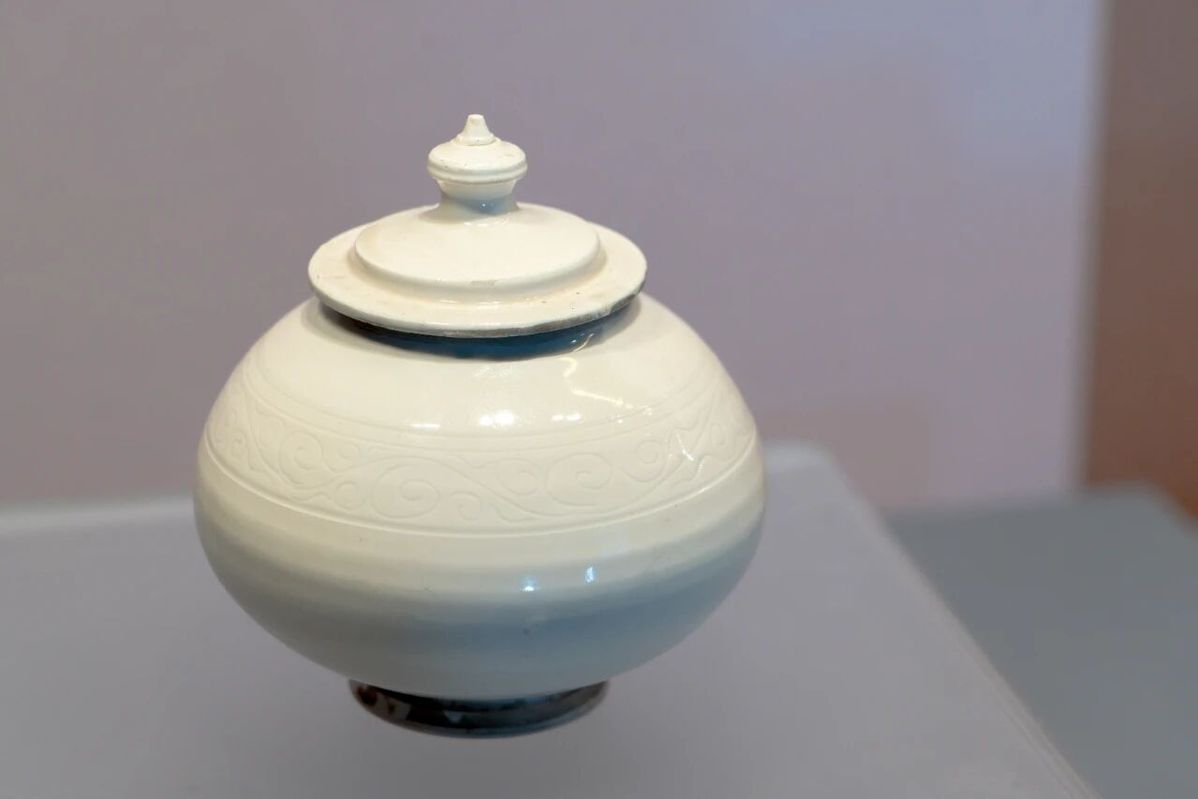 White-glazed lidded pot engraved with curling tendril motifs, Yuan Dynasty, from the collection of the Shanxi Museum [Photo/Shanxi Museum official WeChat account]