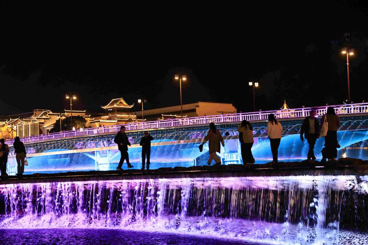 A spectacular water and light show along the Suoxi River in Wulingyuan district, Zhangjiajie, Hunan province, attracted large crowds on Tuesday. [Wu Yongbing/for chinadaily.com.cn]