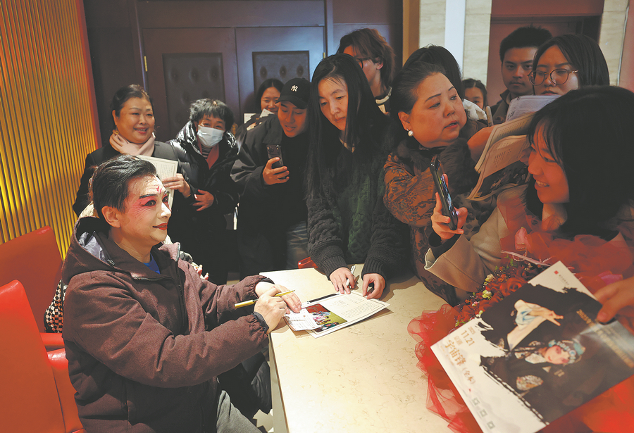 Hu meets with his fans after the performance of Sword of the Cosmos at the Mei Lanfang Theatre in Beijing on Nov 21. ZOU HONG/CHINA DAILY