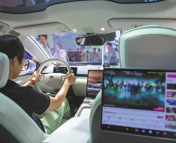 A visitor gets to grips with a Nio cabin at the World Artificial Intelligence Conference in Shanghai in July 2024. CHINA DAILY