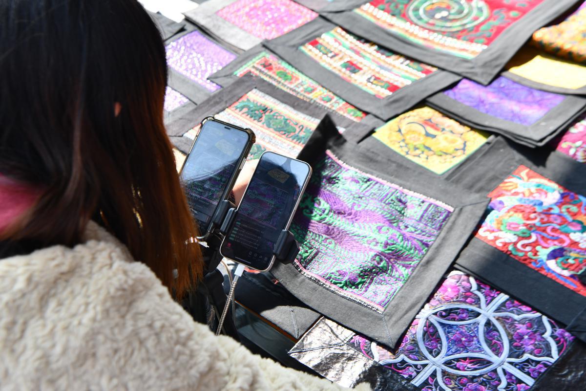 "Merchants from across the prefecture bring embroidered panels and fabrics to sell, and people come to browse through them."