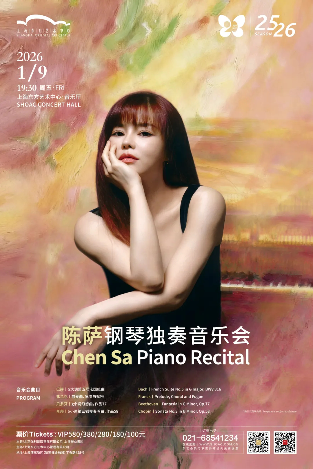 After captivating audiences last year with Liszt’s Sonata in B minor, Chen Sa returns to the Shanghai Oriental Art Center with a new program featuring Bach, Franck, Beethoven and Chopin. On Jan 9, 2026, she will infuse the piano with poetry and reflection, delivering a performance of elegance and depth — a must-see event.