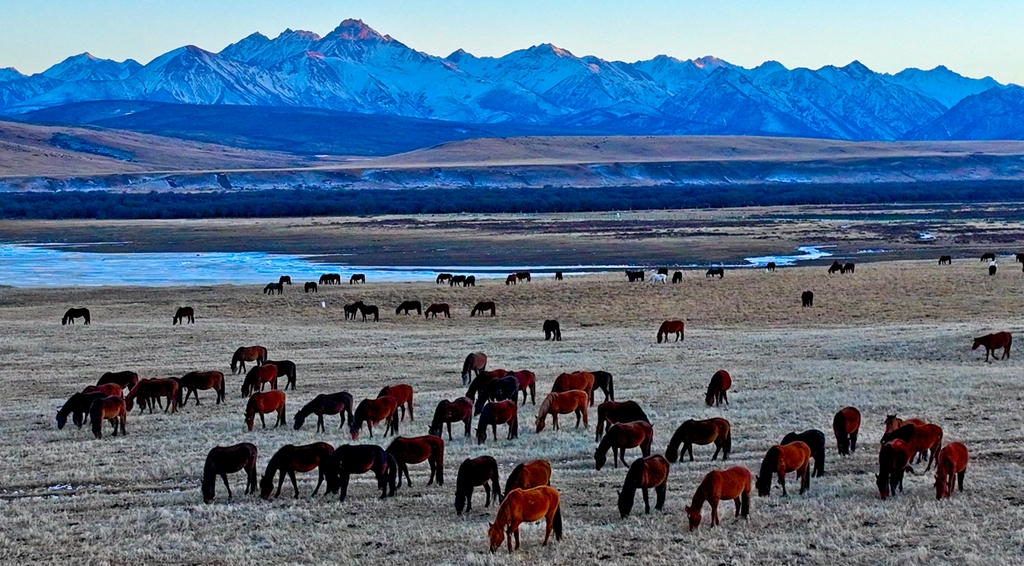 On Dec 2, at sunset in the Shandan Military Horse Farm in Zhangye, Gansu province, the snow-capped Qilian Mountains stood tall and majestic. Bathed in the sunset’s golden glow, the mountains were stunning. On the vast grasslands, herds of fine horses grazed leisurely or galloped freely across the fields, their strong, graceful forms striking against the expansive landscape.