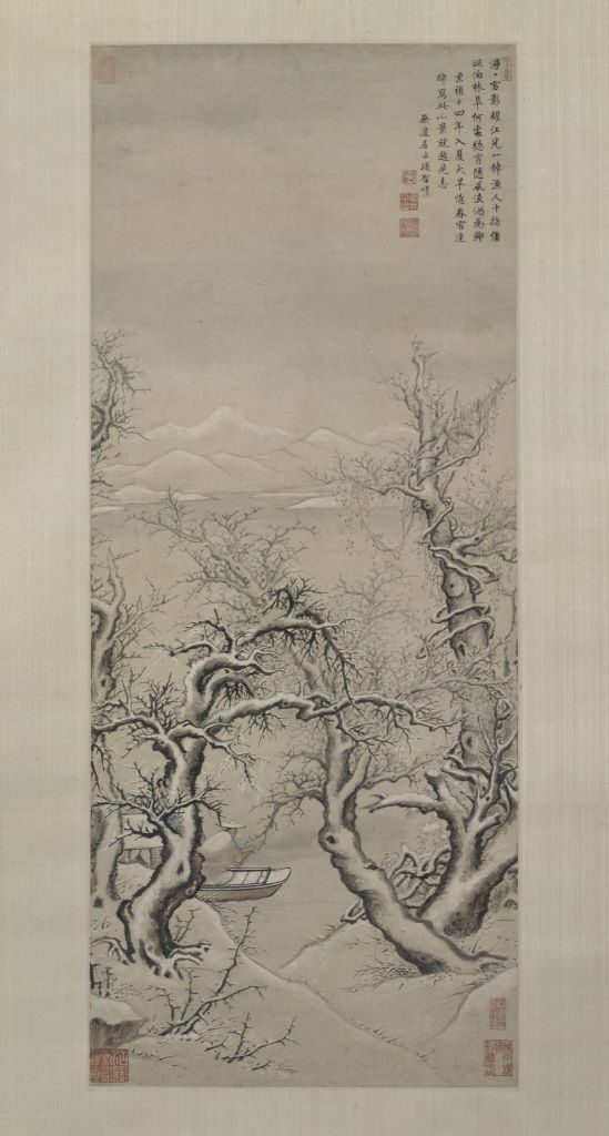 In this painting A Fisherman in Snow, now housed in the Palace Museum, snow blankets four sturdy trees bare of leaves, with their tangled branches against the sky. By the water, a fishing boat rests and a fisherman stands at the bow with his paddle. In the distance, pale mountains look like clouds, stretching into infinity. What a tranquil and poetic winter scene!