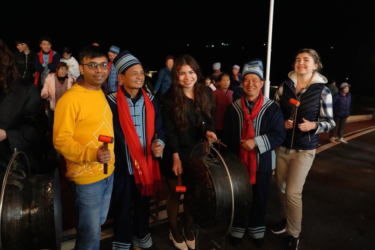 International visitors experience the bronze drum culture of the Zhuang people in Donglan county, Hechi, Guangxi Zhuang autonomous region on Wednesday. [Photo provided to chinadaily.com.cn]