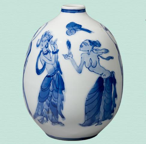 Blue-and-white vase with motifs of Dunhuang dancers, Li Songchai (1933-2007), 1980s, from the collection of the Crafts Museum of China Academy of Art [Photo/Jiangxi Art Museum official WeChat account]