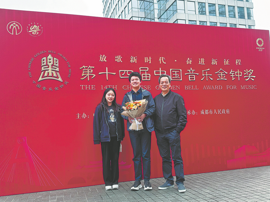 Zhang (middle) and his teacher He Xian (right) at the Chinese Golden Bell Award for Music in 2023. CHINA DAILY