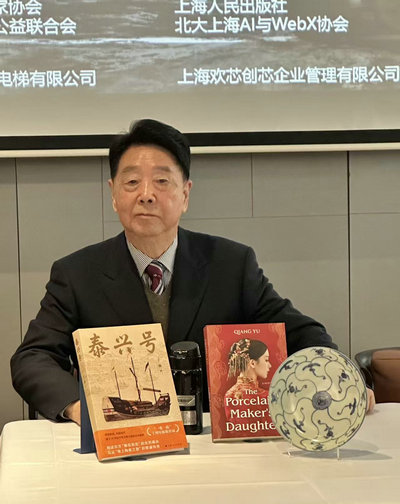 Yu Qiang with his works,  The Tek Sing and its English edition,  The Porcelain Maker's Daughter [Photo provided to chinadaily.com.cn]