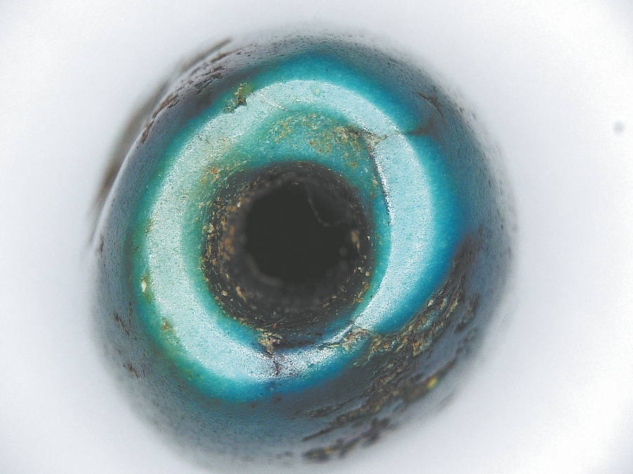 A representative turquoise bead sample shows ancient crafting details. CHINA DAILY