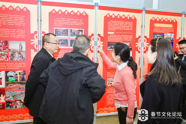 Scholars, representatives from cultural institutions and members who are interested in the revival of cultural traditions attend the Second Spring Festival Culture Forum, held at Beijing Normal University on Sunday. Drum beating, works of handicrafts and creativity products inspired by Spring Festival were all on display. [Photo provided to chinadaily.com.cn]