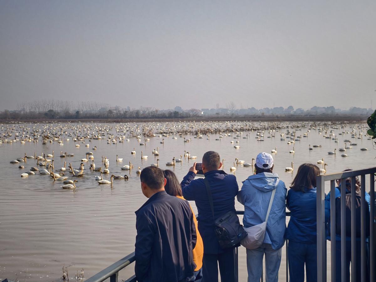 Large numbers of tundra swans are seen wintering at the Donggu Lake wetland in Yueyang, Hunan province, drawing crowds of visitors and photographers. [Photo by Zhou Yang/for chinadaily.com.cn]