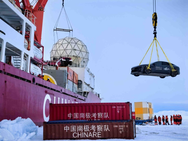 At 6 am (Beijing time) on Dec 7, an AVATR 12 luxury sedan, manufactured in Chongqing, was gently lowered onto the Antarctic ice sheet from the polar research vessel  Xuelong, marking the beginning of its polar testing mission at the Antarctic Central Station. It is the world's first NEV to set foot on the frozen continent. [Photo provided to chinadaily.com.cn]