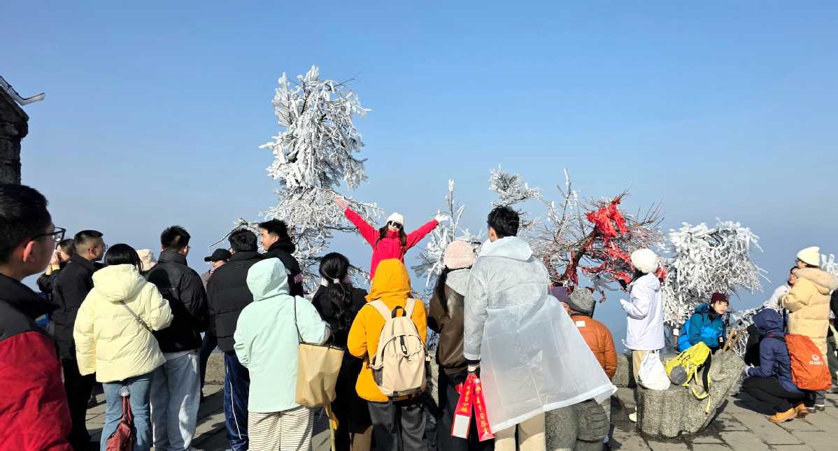 Hengshan Mountain in Hunan province transformed into a glistening winter paradise this past weekend, with spectacular rime scenery drawing visitors after a recent snowfall.