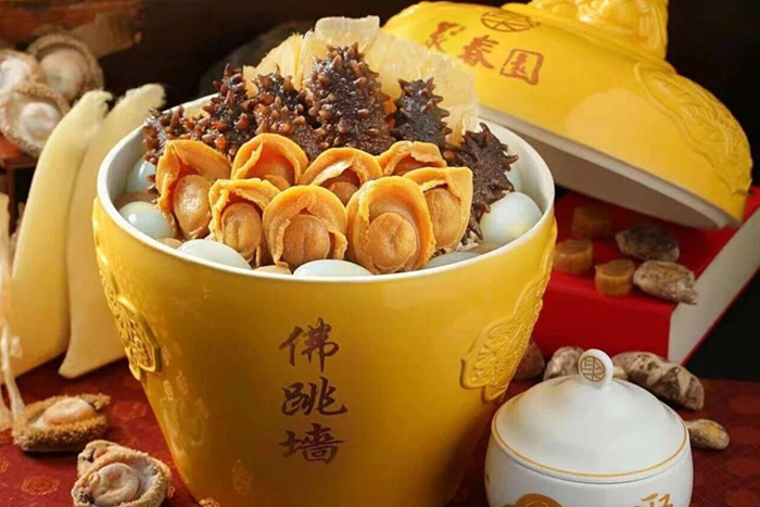 Combining premium ingredients from land and sea — including poultry, fish maw, abalone, sea cucumber, and dried scallops — fotiaoqiang is defined less by the cost of its components than by the labor-intensive process behind it. More than 20 cooking techniques are employed to meld main and auxiliary ingredients into a single, aromatic casserole.