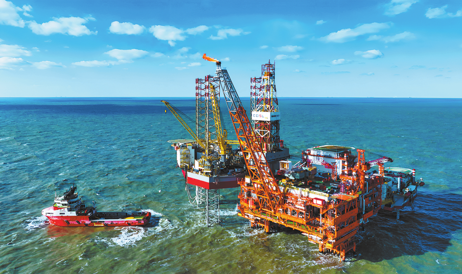 An oil drilling platform seen in the Bohai Sea. DU PENGHUI/XINHUA