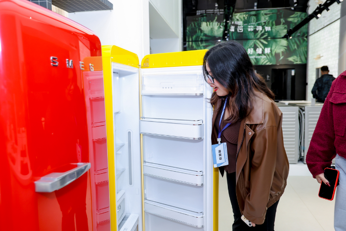 A delegation member experiences the change that smart appliances make in action at GoldenHome. [Photo provided to chinadaily.com.cn]