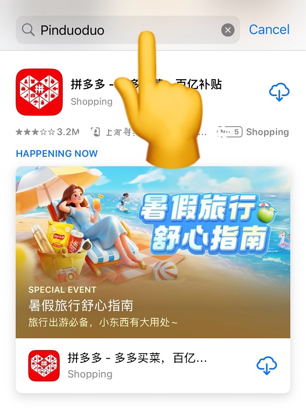 Open your phone's app store, search for "Pinduoduo" (Chinese: 拼多多), download it, and launch the app.