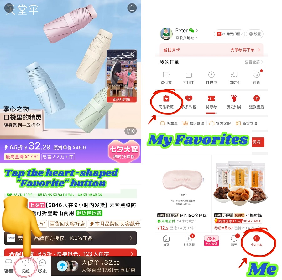 Pinduoduo doesn't have a traditional shopping cart. Instead, tap the heart-shaped "Favorite" (Chinese: 收藏) icon on the product page. Later, go to "Me" → "My Favorites' (Chinese: 商品收藏) to view saved items and check out, similar to using a cart.