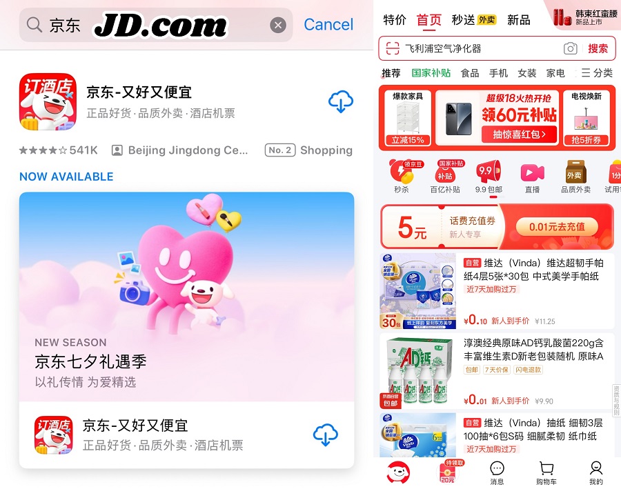 Open your phone's app store, search for JD.com (Chinese: 京东), and download it. Once the installation is complete, open the app to reach the homepage.