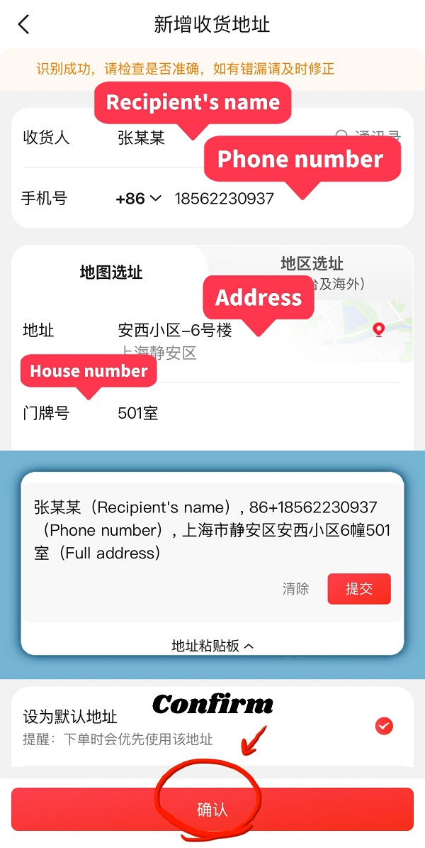 JD.com also offers an "address clipboard" feature called: 地址粘贴板. Copy the recipient's name, phone number, and full address, and paste them into the app. JD.com will recognize the details automatically. Review each field and tap "Confirm" (Chinese: 确认).