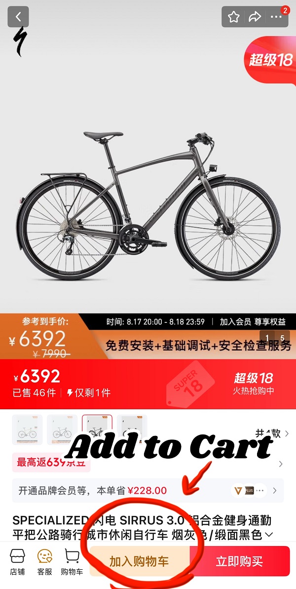 Tap a product to see its details, including specifications, reviews, and shipping options. If needed, take a screenshot and use a translation app for the description. Select your preferred variation, such as size, color, or model, and tap "Add to Cart" (Chinese: 加入购物车).