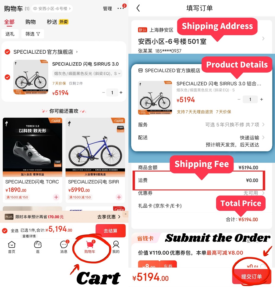 Open your shopping cart, select the item(s) you want, and tap "Checkout" (Chinese: 去结算). Verify your shipping address, product details, quantity, shipping fee, and total price. If everything is correct, tap "Submit the Order" (Chinese: 提交订单).