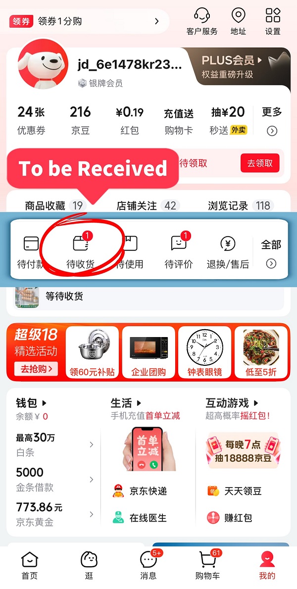 Once your order has shipped, go to "Me" → "To be Received" (Chinese: 待收货) to view tracking details. JD.com is known for fast, reliable delivery. All you have to do now is wait for your package to arrive!