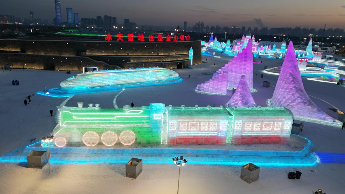 At the 27th Harbin Ice and Snow World in Harbin, Heilongjiang province, an ice sculpture of a steam train that emits real steam has attracted numerous visitors. [Photo by Liu Yang/For chinadaily.com.cn]