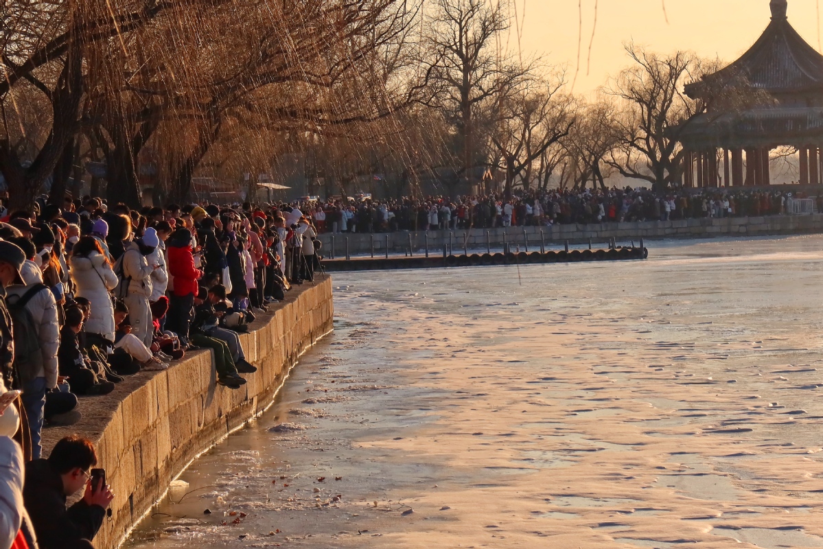 People throng the Summer Palace in Beijing to capture the sunset's glow as it shines through the 17-Arch Bridge, on Dec 21, 2025. [Photo by Jiang Dong/chinadaily.com.cn]