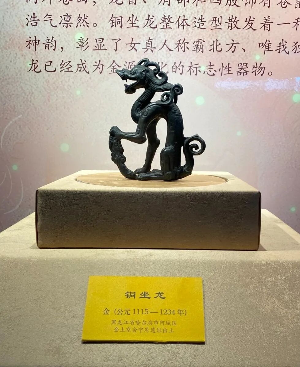 At the Museum of Heilongjiang Province, a striking exhibition is centered exactly on a single treasure: a seated bronze dragon of the Jurchen Jin Dynasty (1115-1234). The dragon is in a crouching pose, head slightly raised, and mouth open as if roaring. Its shoulders slightly lean forward, the tail curls outward, and coiled manes ripple across the head, shoulders, and limbs. Both powerful and poised, it captures motion and stillness simultaneously.