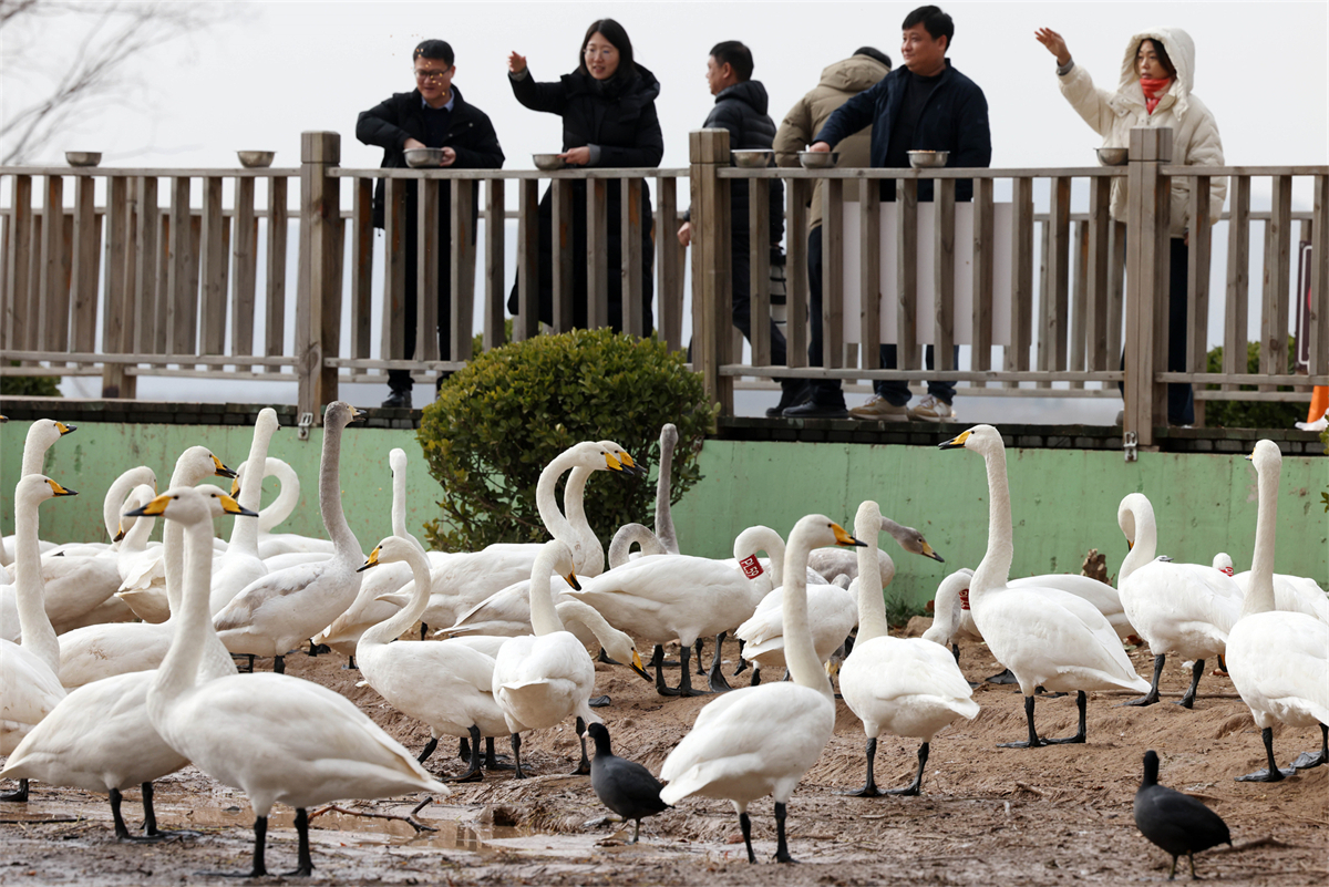 Visitors feed wild white swans at the Yellow River wetland in Pinglu county, Yuncheng city, North China's Shanxi province, on Dec 23, 2025. [Photo by Zhu Xingxin/chinadaily.com.cn]