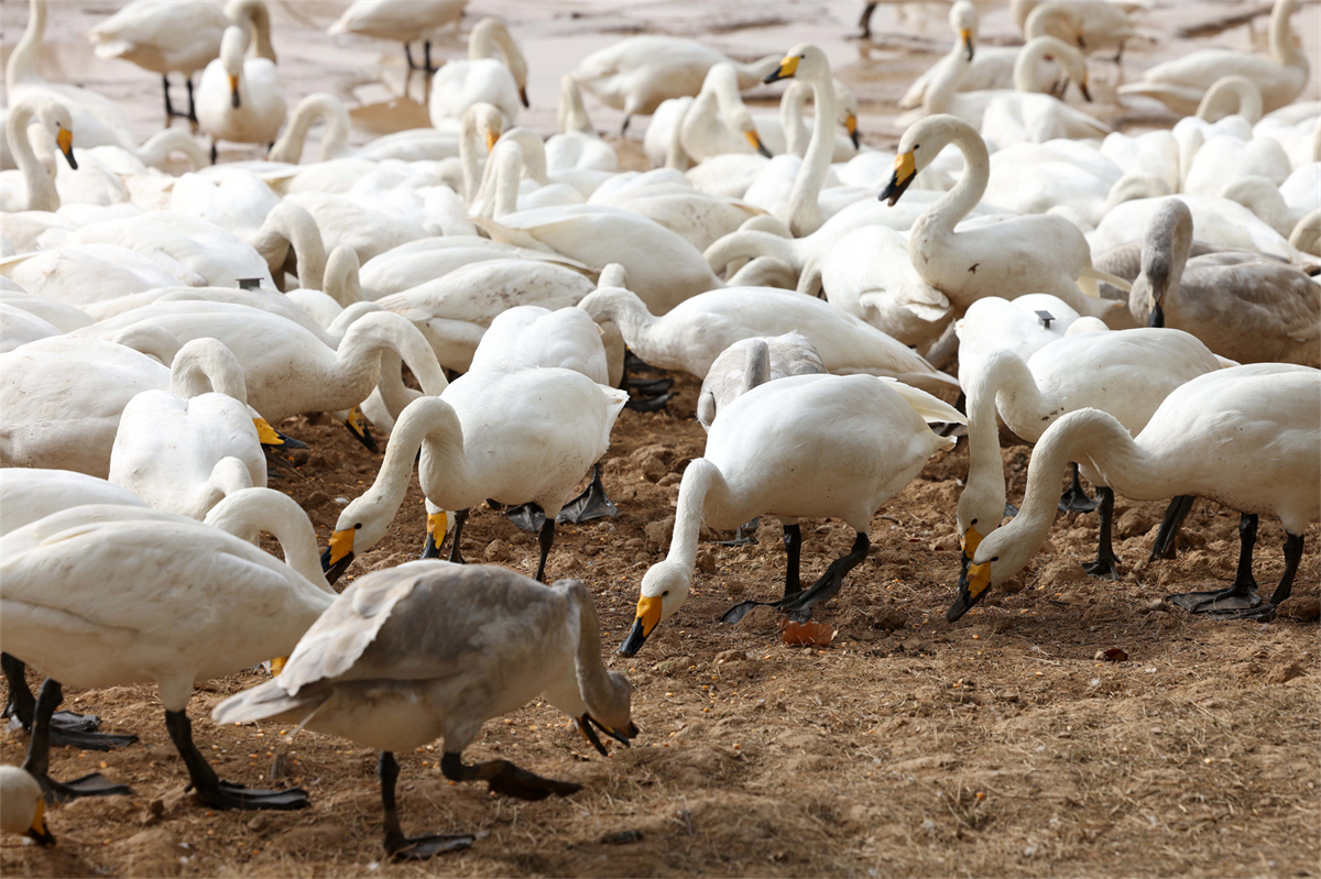 Flocks of wild white swans forage on the banks of the Yellow River wetland in Pinglu county, Yuncheng city, North China's Shanxi province, on Dec 23, 2025. [Photo by Zhu Xingxin/chinadaily.com.cn]
